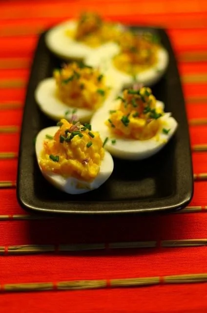ШАГ 4 Разложите начинку в белки и выложите на блюдо. Сверху посыпьте паприкой.