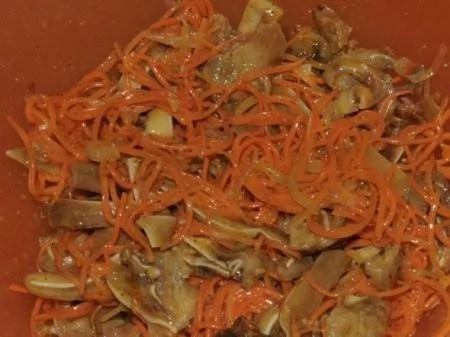 ШАГ 4 В хорошо раскаленное масло добавляем подготовленную морковь и ушки, быстро все перемешиваем, прожариваем, постоянно помешивая, примерно одну минуту.