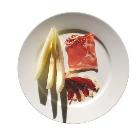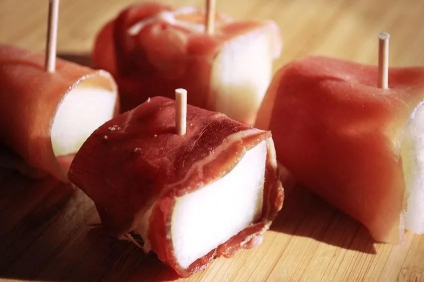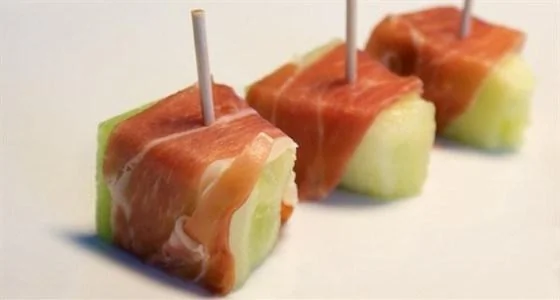 ШАГ 2 Перед подачей на стол обернуть кусочки дыни ломтиками хамона и проткнуть шпажками.