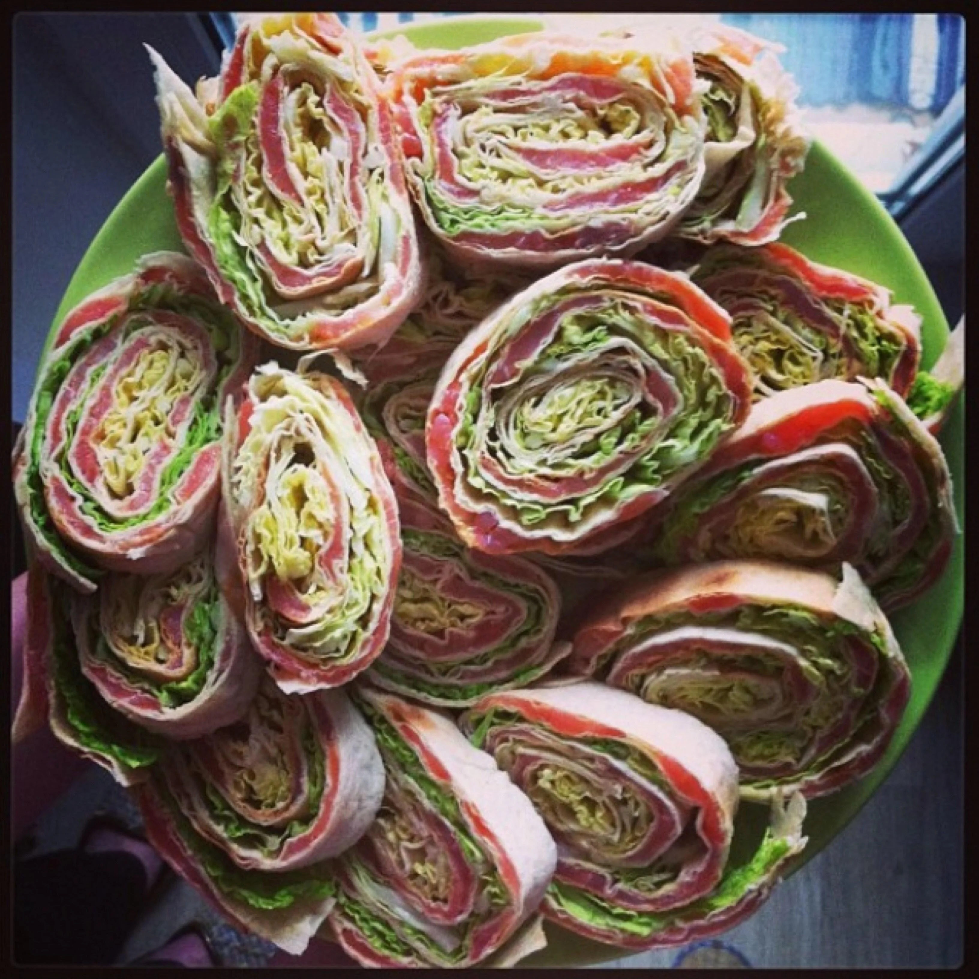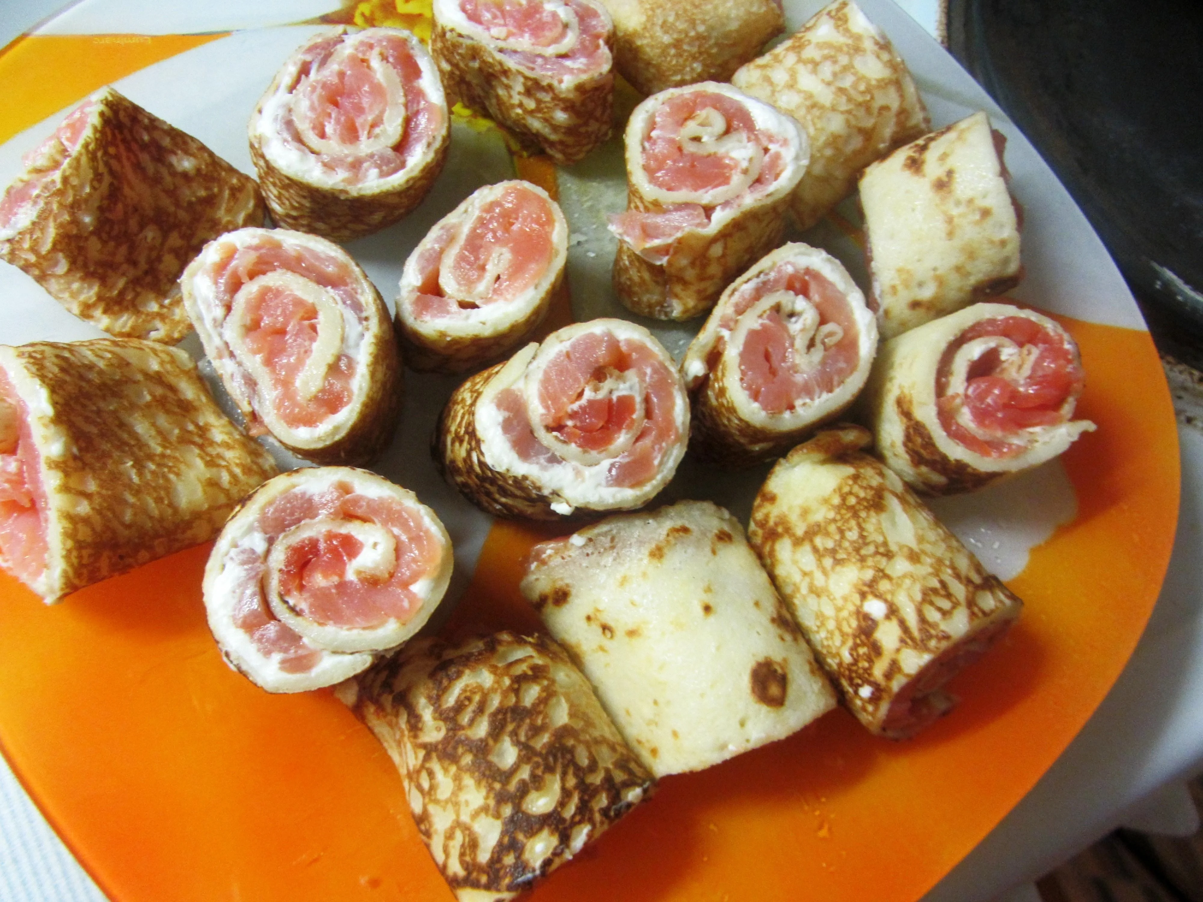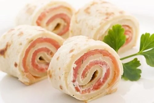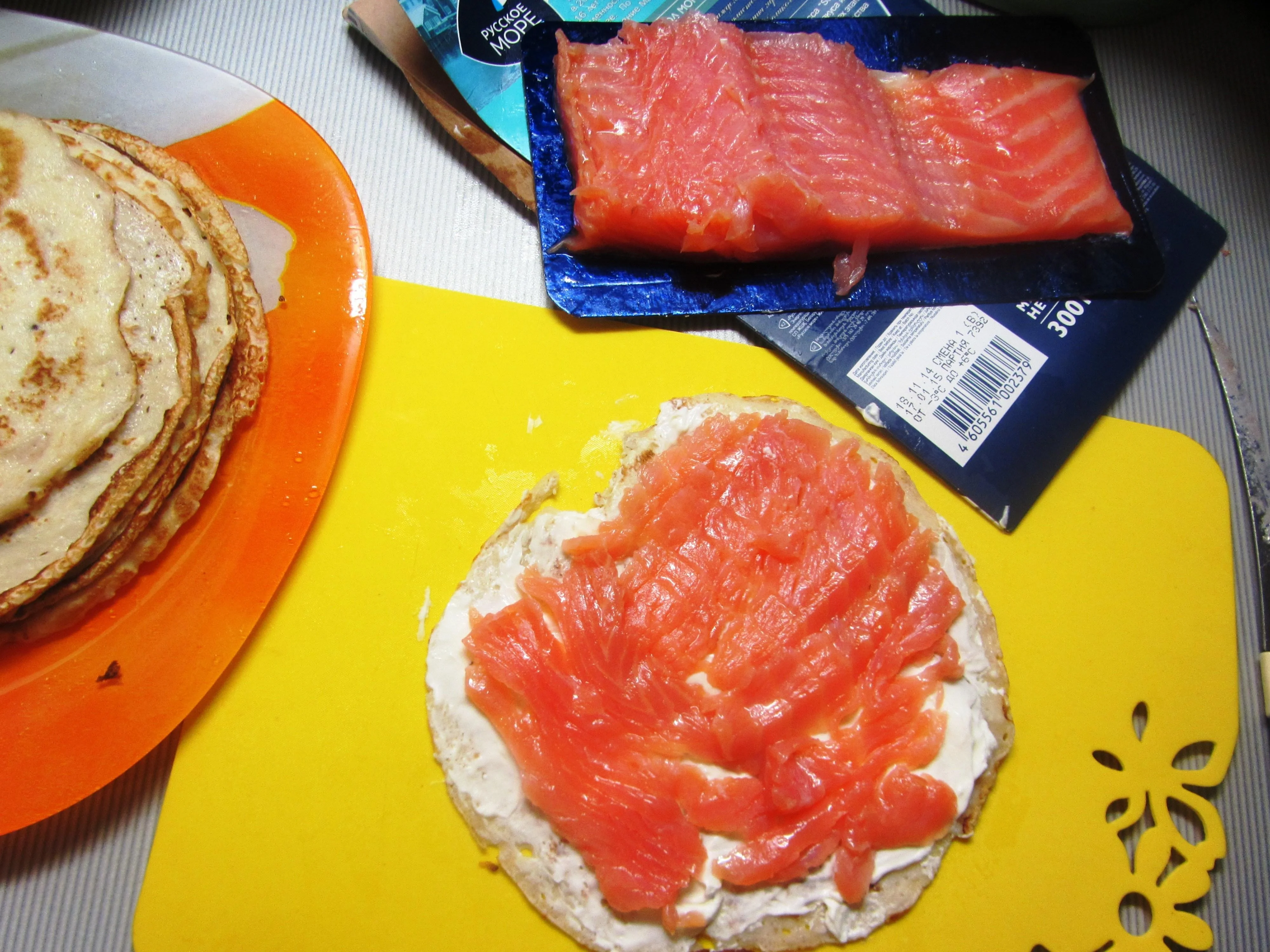ШАГ 4 Раскатать пласт лаваша, смазать его полученной пастой из сыра, а сверху выложить плотным слоем нарезанную семгу. Все завернуть в рулет и нарезать на порционные кусочки. Блюдо можно подавать к столу.