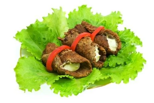 ШАГ 3 На каждый кусок мяса положите немного сыра и 2–3 ломтика перца. Заверните плотным рулетом и скрепите зубочисткой. Выложите на блюдо.
