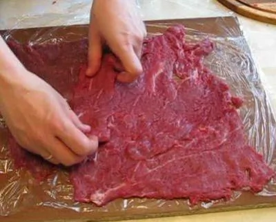 ШАГ 4 Разложить подготовленный мясной пласт на ровной поверхности; для удобства сворачивания рулета в дальнейшем, лучше предварительно расстелить пекарскую бумагу. Если у вас мясо порезано не одним куском, после отбивания раскладывайте отбитые куски слегка внахлест.