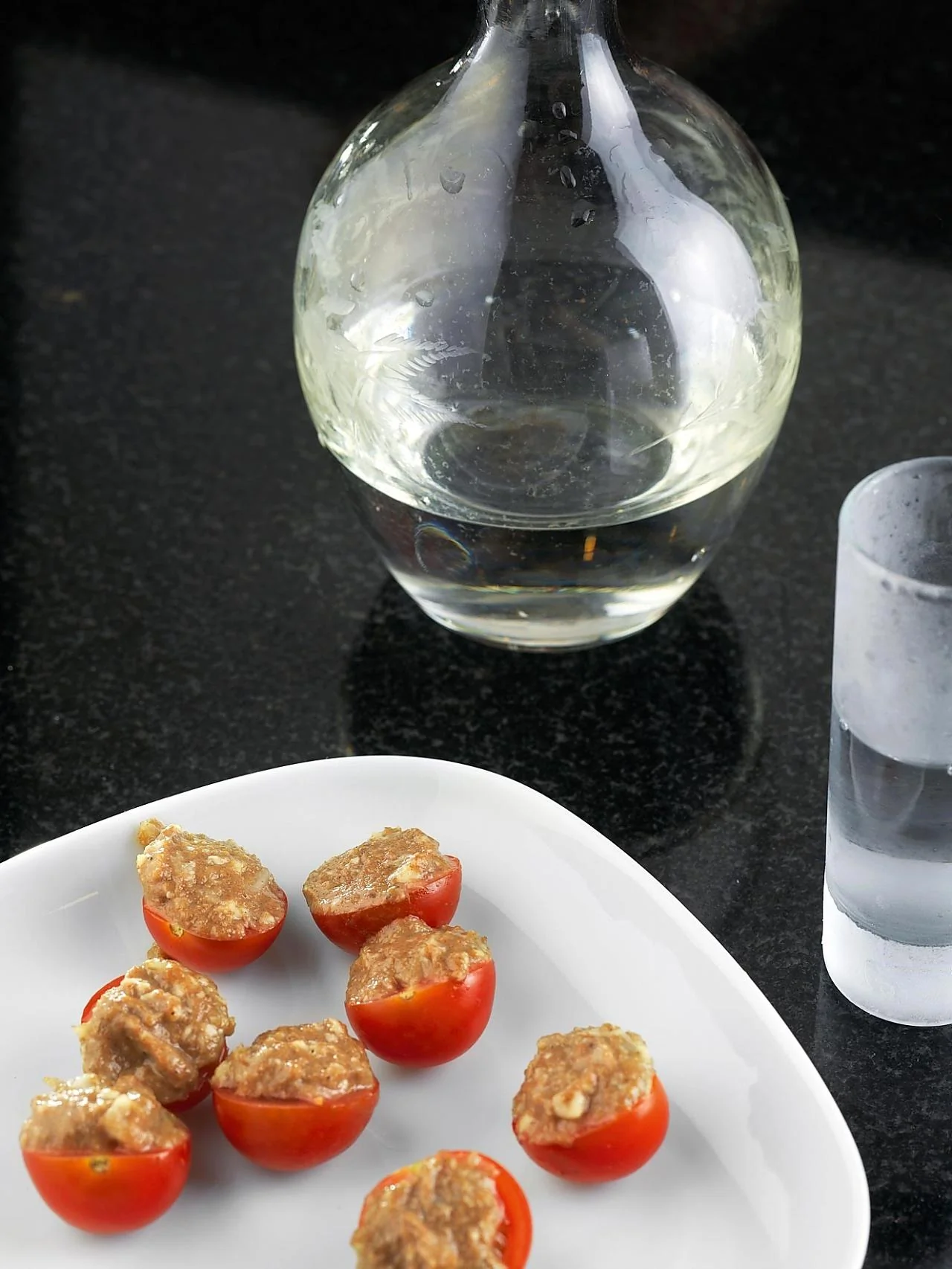 ШАГ 4 Помидоры черри разрезать пополам, внутренности аккуратно удалить маленькой острой ложкой паризьен или ножом и нафаршировать половинки чесночной пастой.