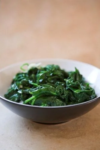 ШАГ 2 Мелко нарежьте шпинат и выложите в сотейник. Накройте крышкой и готовьте 4–5 минут, пока листья не станут слегка мягкими. Переложите в металлическую миску, посолите и поперчите. Посыпьте чесноком и подавайте с дольками лимона.