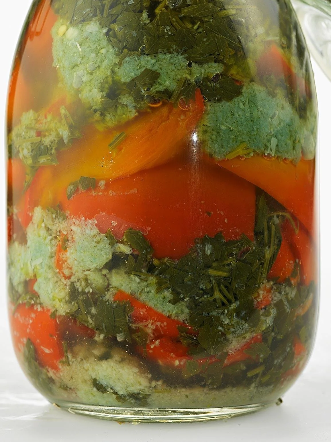 ШАГ 3 Держать перец в кипящем масле нужно минут пять, пока его внутренняя часть не станет мягкой и не будет легко поддаваться нажатию ложки. Выложить перцами первый слой в литровой банке. Затем в кипящее масло опустить мелко нарезанную петрушку (как и перец, в дуршлаге), чтобы она уварилась. Как только масло заберет цвет петрушки и станет зеленым, петрушку переложить в банку поверх перца и следом опустить в кипящее масло в дуршлаге чеснок. Как только он уварится и впитает цвет, достать его из дуршлага и уложить в банку еще одним слоем.