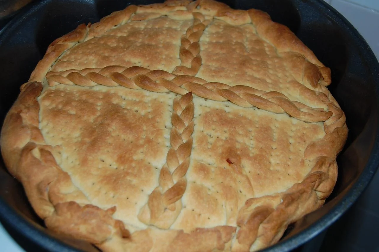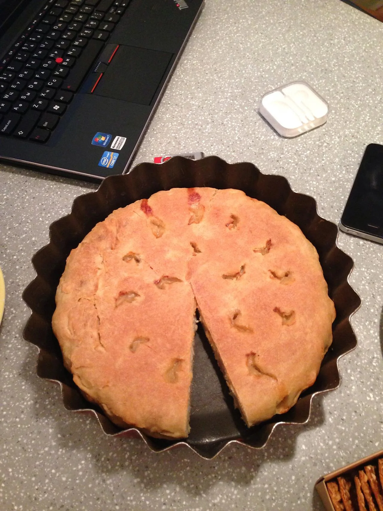 ШАГ 3 Достать тесто из холодильника. Обе части раскатать в тонкие прямоугольники, один положить в форму (оптимальная прямоугольная 30х20 см, но подойдет и противень), выложить и равномерно распределить начинку, накрыть вторым пластом, защипать края. Сделать несколько проколов по периметру.