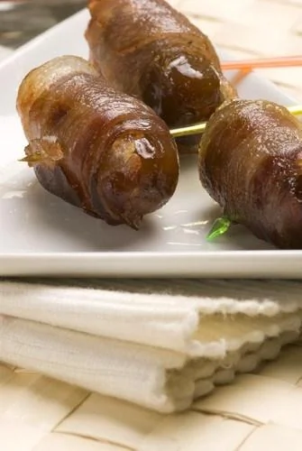 ШАГ 4 На ломтики бекона выложите по финику и полоске кураги. Заверните рулетиками и закрепите зубочистками.