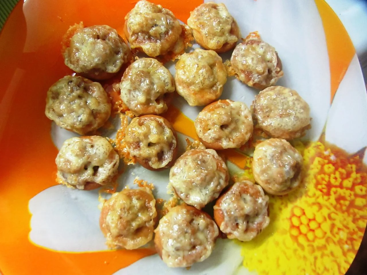 ШАГ 4 Положить шарики в дырочки в бубликах и прижать фарш пальцами.