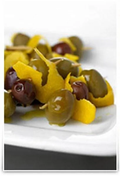 ШАГ 7 Наколоть на шпажки по несколько оливок, разделяя их между собой завитушками из цедры. Вы можете делать сеты из одинаковых сортов или собирать ассорти.