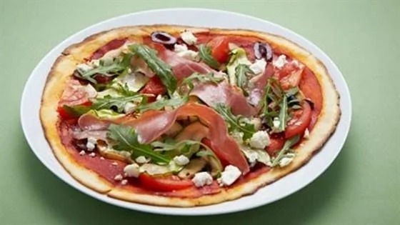 ШАГ 3 Питу разрезать вдоль на 2 половинки. Срез намазать томатным соусом. Выложить цукини, грибы, помидоры и оливки по всей поверхности пиццы. Сверху выложить прошутто. Сбрызнуть оливковым маслом и поместить в духовку на 10–15 минут. Добавить нарубленный шпинат и натертый сыр фета. Еще раз сбрызнуть оливковым маслом и поставить в духовку еще на 3–5 минут.