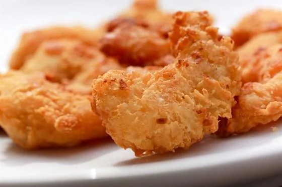 ШАГ 6 Бросить приблизительно треть креветок в кляр, мягко перемешать, достать. Затем при помощи шумовки опускать креветки в масло по одной штуке. Дать им прожариться 2–3 минуты (пока кляр не станет хрустящим и светло-золотым). Если вы сразу бросите все креветки, то это снизит температуру масла и креветки вряд ли получатся хрустящими. По готовности достать шумовкой и положить сушиться на бумажное полотенце, пока готовятся две другие партии креветок.