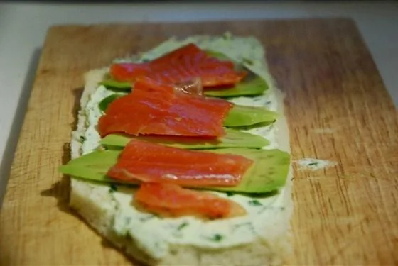 ШАГ 4 Сверху положить тонкие ломтики авокадо и форели.