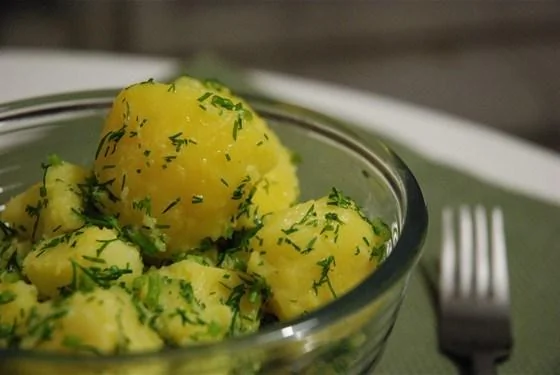 ШАГ 2 Половину вареной картошки разрезать на четыре части. Добавить 3 столовые ложки масла и половину мелко рубленной зелени. Посолить, поперчить и все перемешать. Картофель по-домашнему готов.