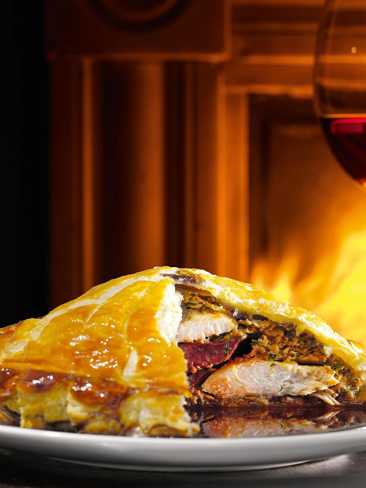 ШАГ 9 Смазать верх пирога взбитым яйцом, отправить на десять минут в холодильник, затем еще раз смазать яйцом. Поставить в духовку, нагретую до 180 градусов, на тридцать-сорок минут. За это время слоеное тесто превратится в румяную корочку. На всякий случай хорошо иметь термометр, которым можно измерить температуру внутри пирога; в данном случае термометр должен показать около 62 градусов. Готовый пирог разрезать на куски и немедленно подавать с соусом.