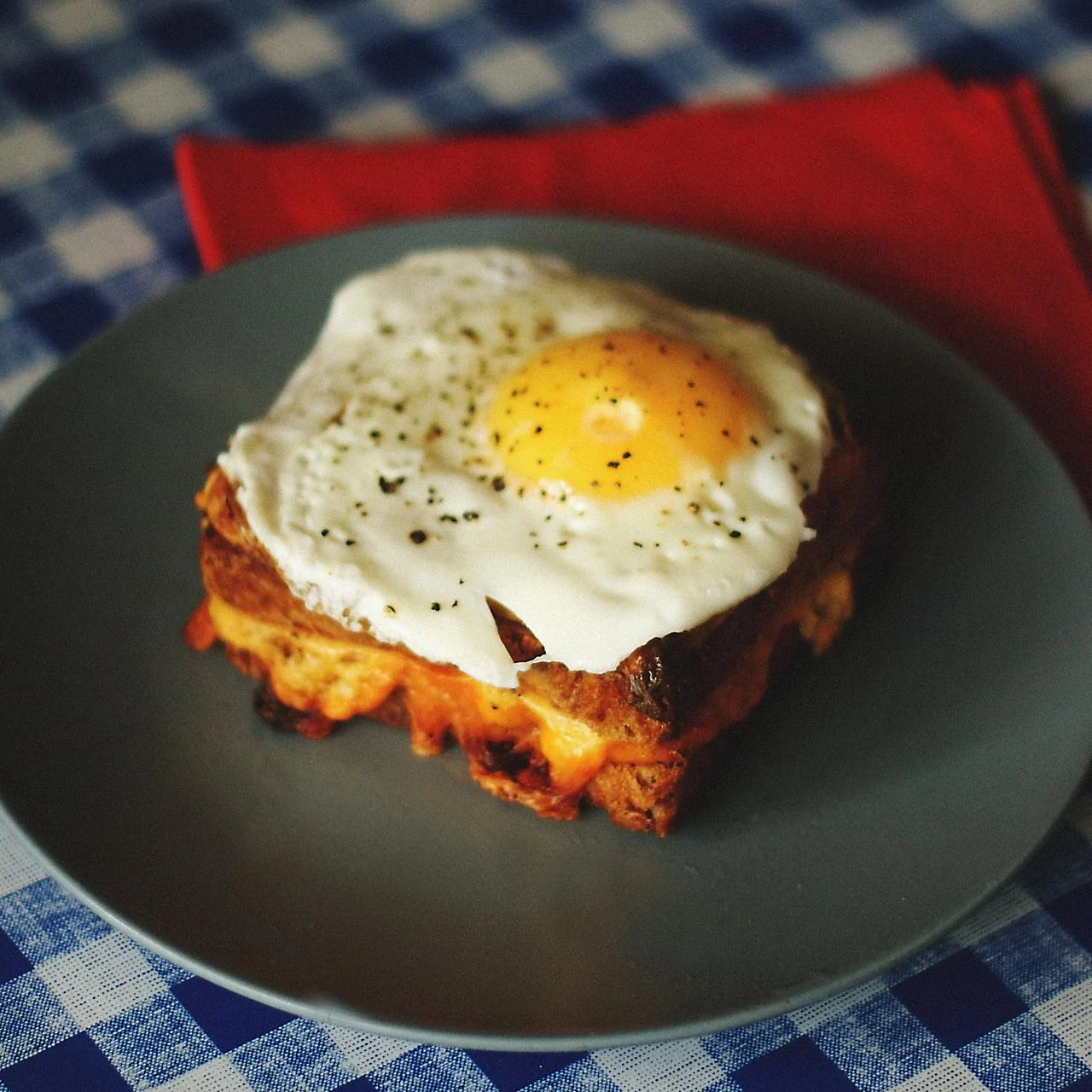 ШАГ 5 Подогреть оставшееся масло в сковороде на умеренном огне. Когда спадет пена, разбить в сковородку яйца, приправить солью и перцем и жарить глазунью около трех минут, чтобы белки схватились, а желток еще оставался жидким. Каждый сэндвич накрыть яичницей — и сразу же подавать.