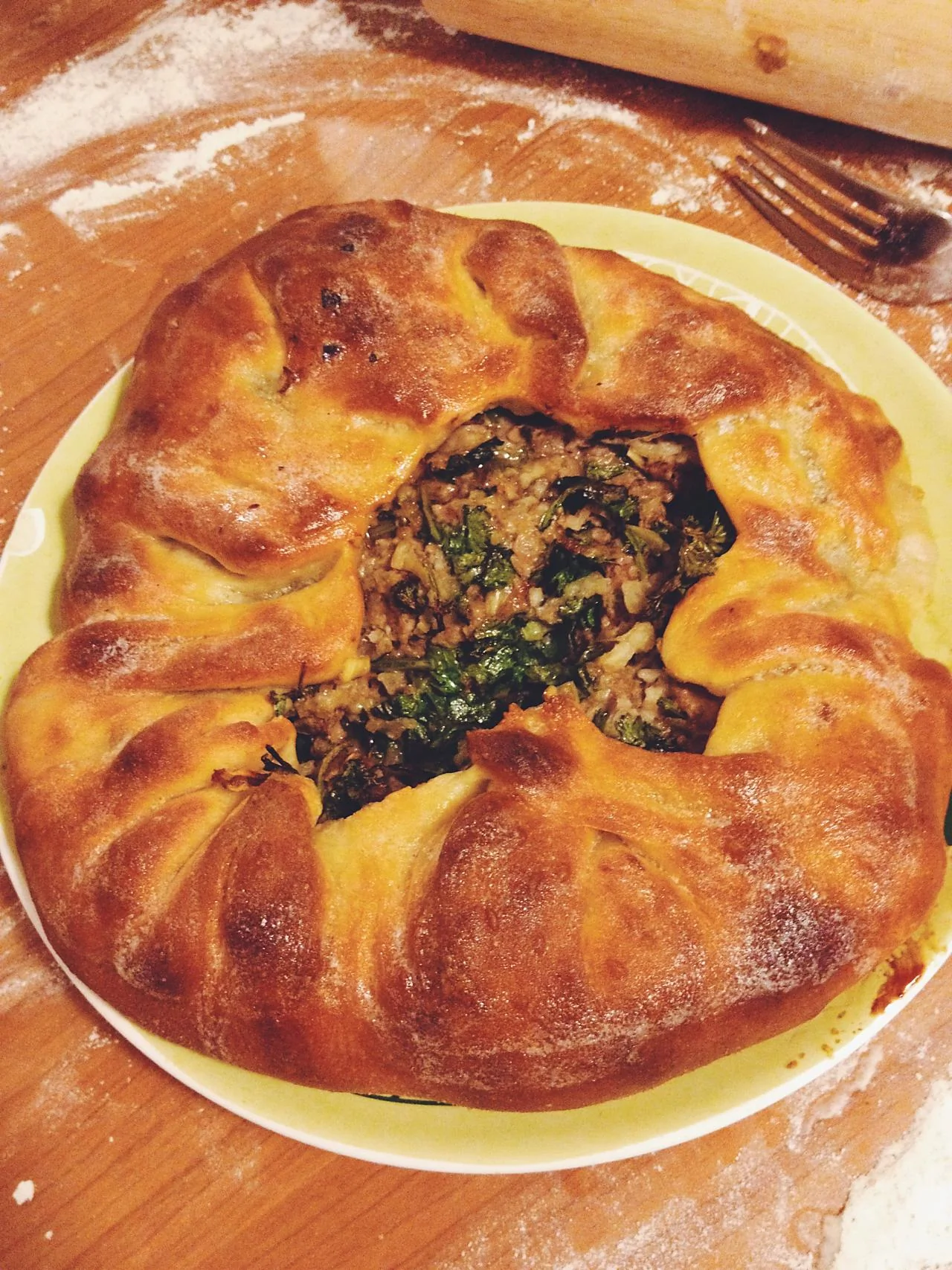 ШАГ 4 Выложить в центр каждого пирога 200 грамм начинки, соединить края теста и защипнуть их сверху. Чуть присыпать кубдари мукой и раскатать их до толщины 8–10 мм и диаметра форм для выпечки.