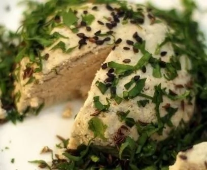 ШАГ 5 Полученную массу снова поместить в марлю, на этот раз отжать уже с усилием. Получится вкусный ореховый соус со специями. Сыр должен приобрести консистенцию плавленного сыра. Подвесить его в марле на веревке на 8 часов для ферментации. После этого сыр можно нарезать и украсить свежей зеленью.