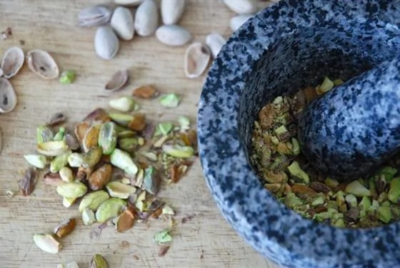 ШАГ 2 Фисташки очистить и мелко нарубить, можно немного потолочь в ступке.