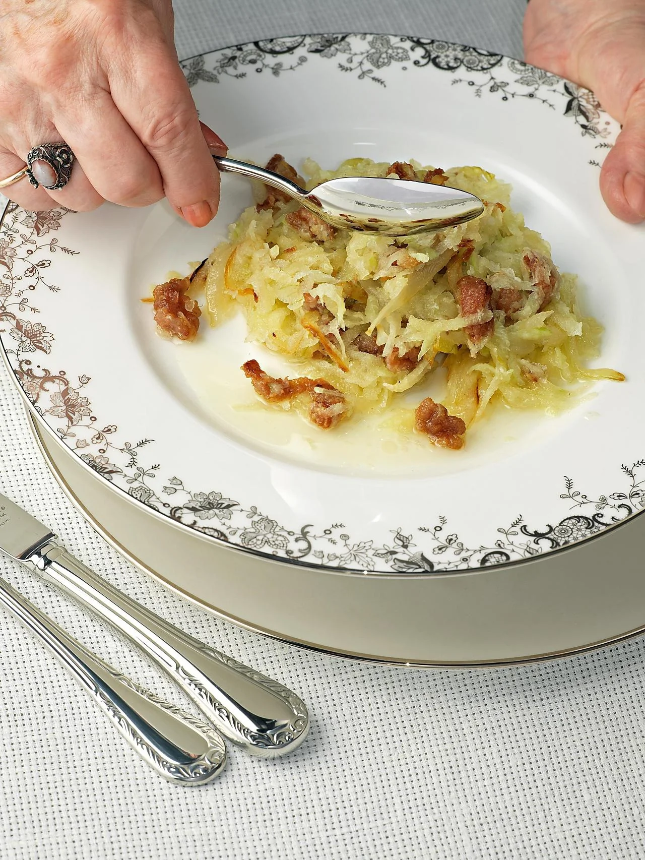 ШАГ 2 Мелко нарезать куриный жир с кожей и обжарить на подсолнечном масле — сначала на сильном огне, потом его убавить. Когда шкварки зарумянятся, выложить нарезанный тонкой соломкой лук (понадобится крупная луковица). Посолить. Жарить, помешивая, до золотистого цвета, затем остудить.
