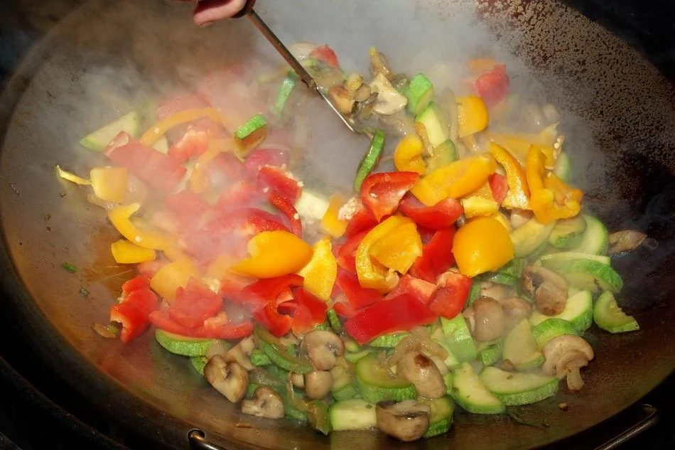 ШАГ 3 Сильно разогрейте вок, налейте в него оливкового масла и выложите овощи в следующем порядке: сначала лук, а затем кабачки, перцы и шампиньоны. Овощи необходимо постоянно перемешивать, они должны обжариваться, а не тушиться и остаться на вкус чуть недожаренными. Когда овощи достигнут такой степени готовности, влейте в них соевую смесь с крахмалом, поперчите по вкусу и все тщательно перемешайте.