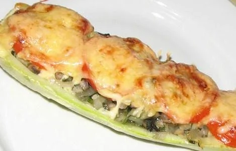 ШАГ 1 Кабачок разрезать вдоль, вырезать сердцевину и отварить на пару до готовности.