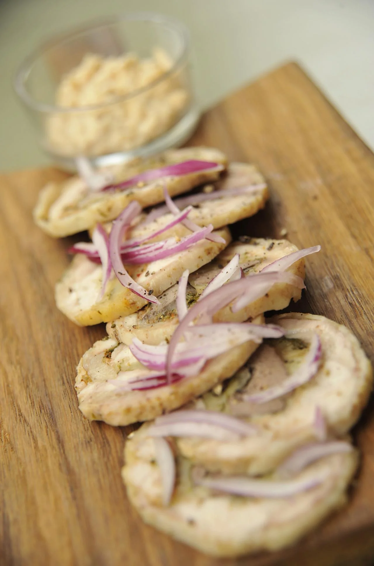 Куриный рулет, фаршированный печенью кролика, сулугуни и болгарским перцем