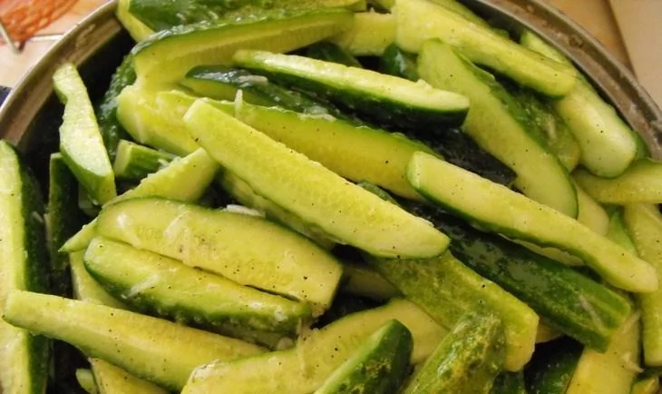 ШАГ 1 Не крупные огурцы разрезать на 4 части вдоль.