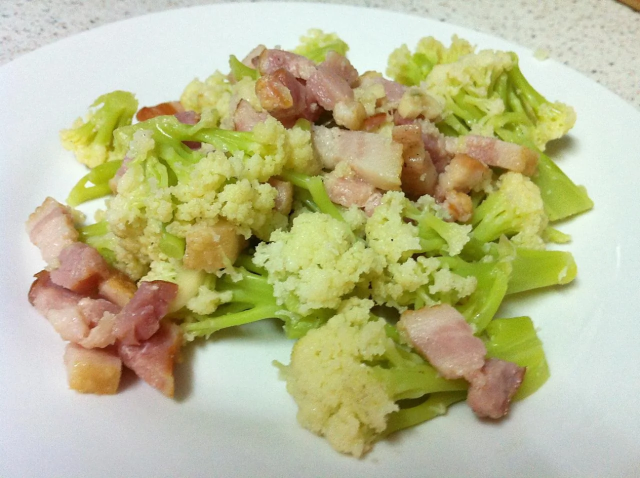 ШАГ 3 Добавляем к бекону цветную капусту. На этом этапе, если любите, можете добавить мелко порубленный чеснок. Все перемешиваем и поджариваем еще минут 5 (солить ничего не придется, так как в копченом беконе и так есть соль, но все равно ориентируйтесь на свой вкус). Все готово!