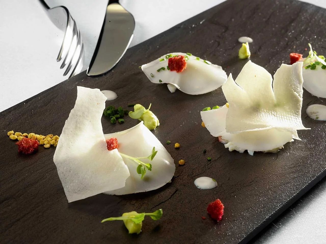 ШАГ 5 При подаче украсить блюдо чипсами из йогурта и риса, муссом из авокадо, кольцами лука-резанца, цветочной пыльцой и свекольными чипсами.