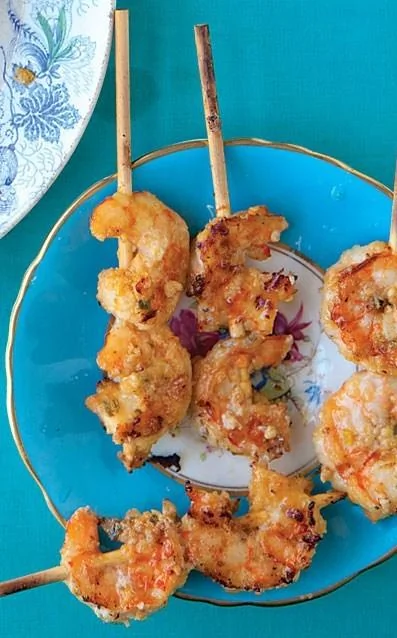 ШАГ 1 Очистите креветки. В миске перемешайте креветки и сок лайма, отставьте в сторону. Пюрировать лук-шалот, сахар, соль, чеснок, орехи, чили и имбирь в блендере.