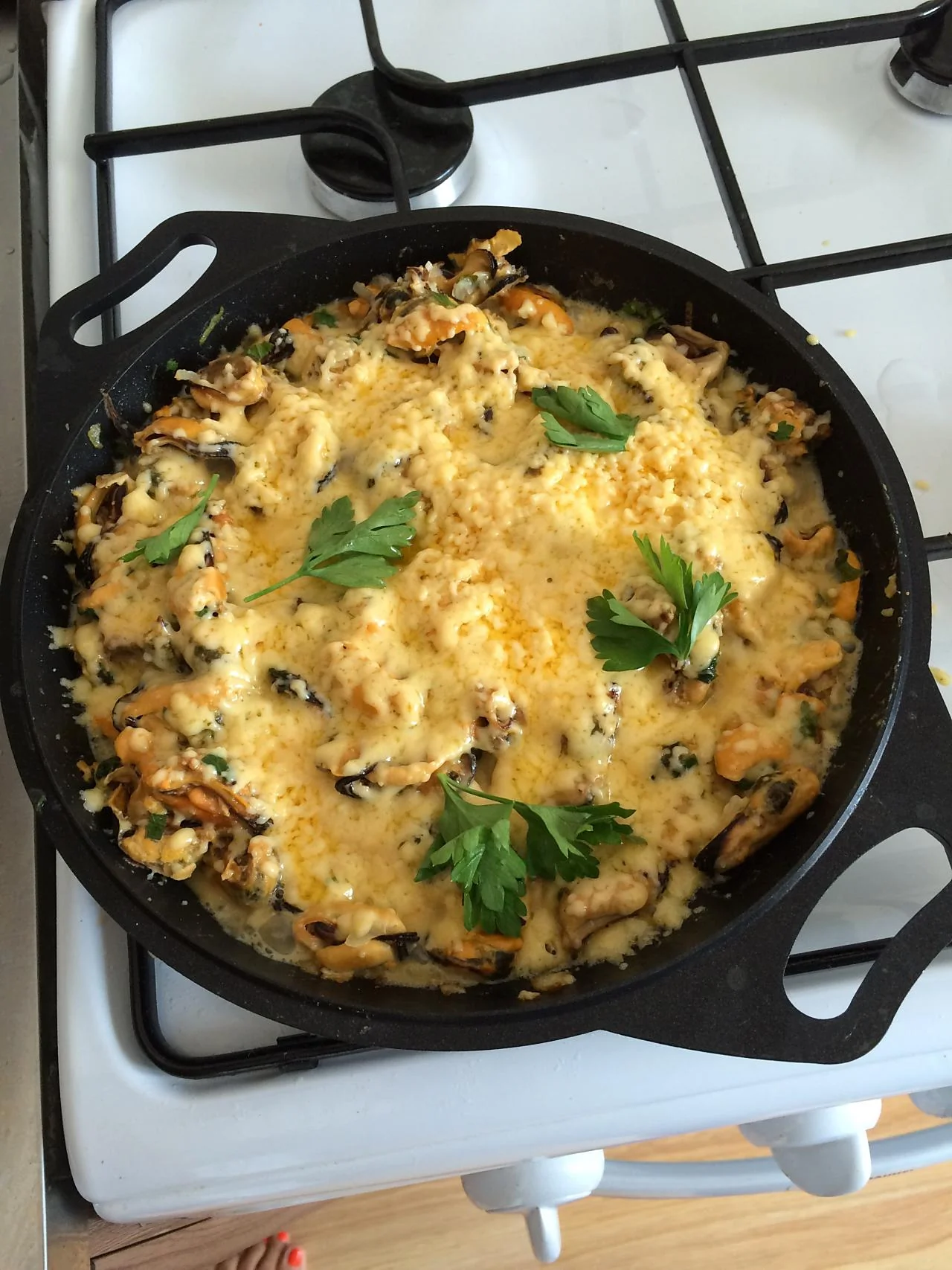 ШАГ 1 На сливочном( это очень важно, так как от этого зависит вкус) масле поджарить лук, добавить туда же мидии без панциря, обжарить еще минут 5–7.