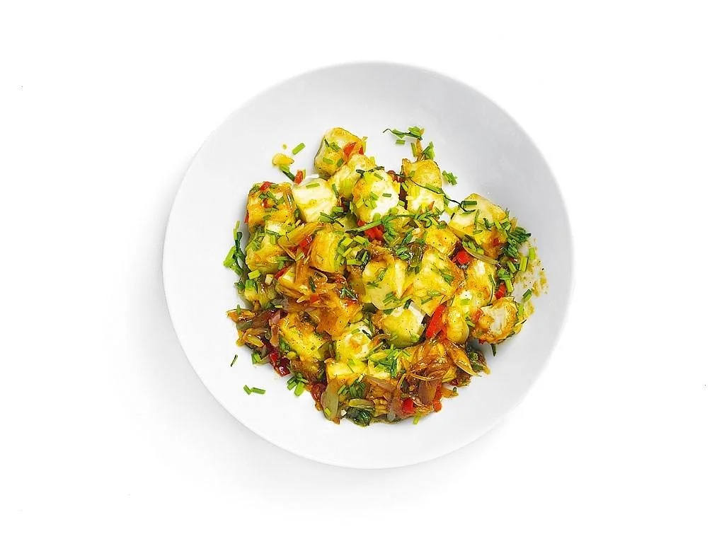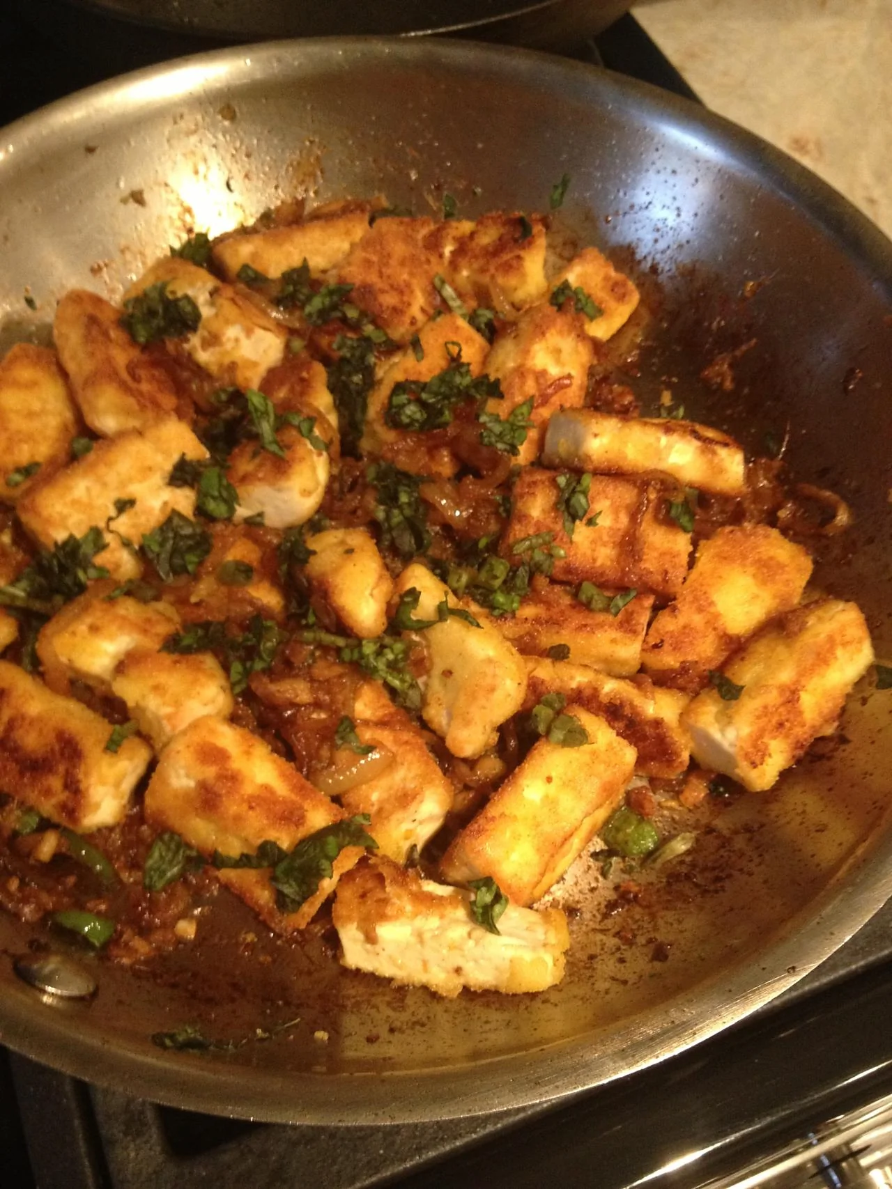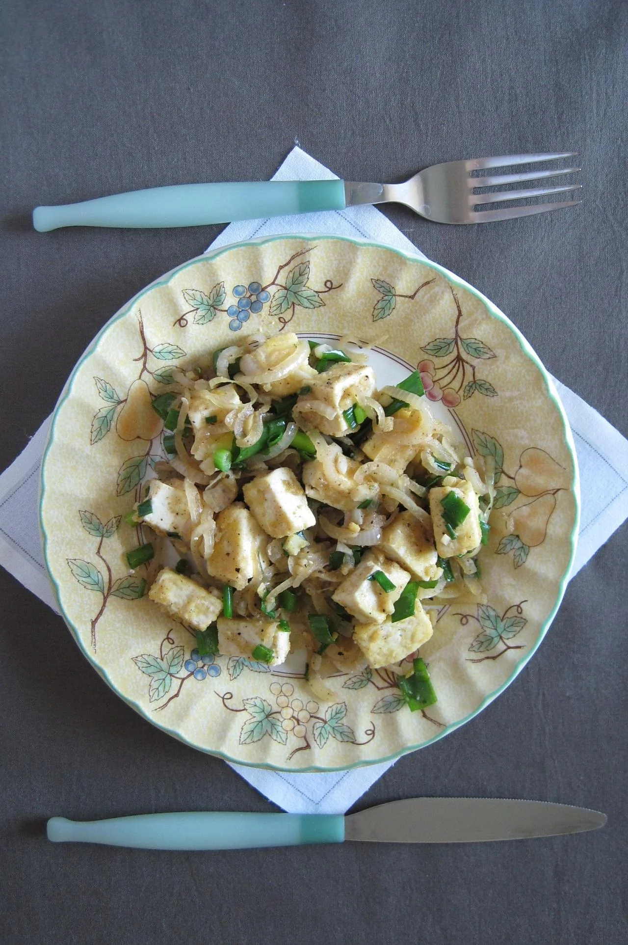 ШАГ 4 Вернуть на огонь сковородку с луком и чесноком, добавить тофу, рубленый зеленый лук, перемешать аккуратно — и подавать.