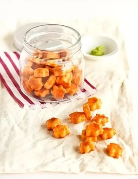 ШАГ 3 Духовку разогрейте до 180 градусов. Крекеры выложите на противень, застеленный бумагой, и выпекайте 15–20 минут до золотистого цвета. Остудите. Если вкус васаби не слишком сильный, то перемешайте крекеры с сухим порошком васаби, либо подавайте с пастой.