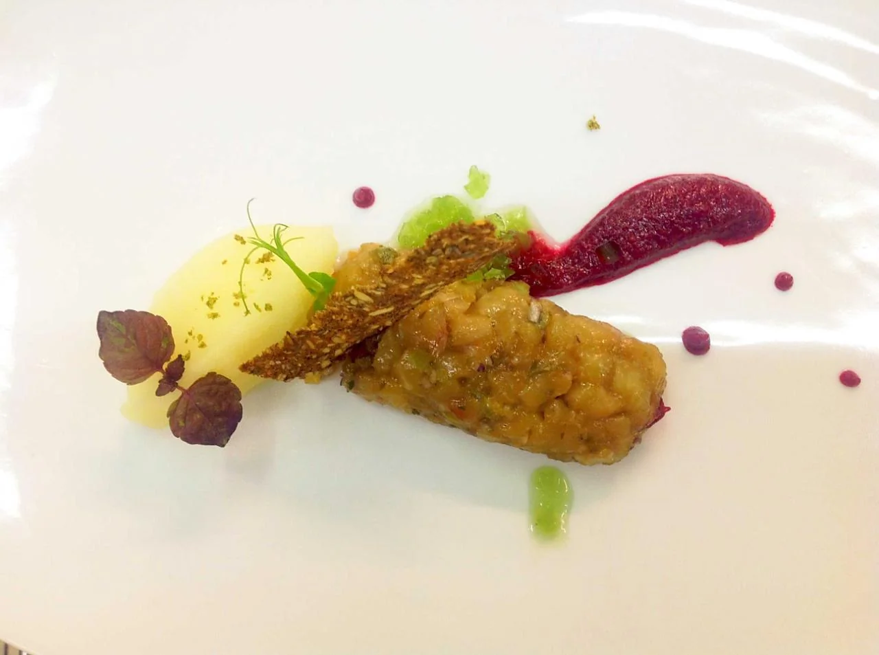 Тартар из муксуна со свекольным пюре и сорбетом из тайского лайма