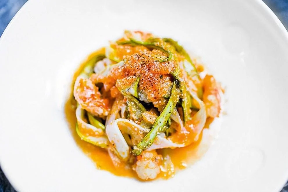 ШАГ 2 С побегов спаржи срезать грубую кожицу с помощью овощечистки, нарезать их вдоль тонкими полосками вроде тальятелле. Тушить примерно две минуты, пока они не станут чуть мягче, и переложить на тарелку.