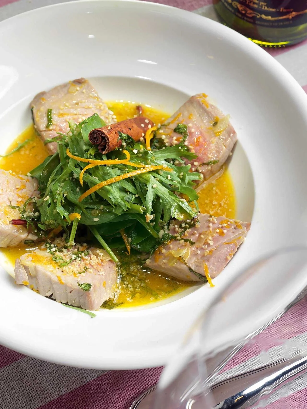 ШАГ 3 Влить в сковороду красное столовое вино, положить томатную пасту. Дать вину выпариться, добавить тунца, нарезанного на куски, подогреть. Перед подачей посыпать подрумяненными на сковороде панировочными сухарями и украсить смесью салатных листьев и цедрой апельсина.