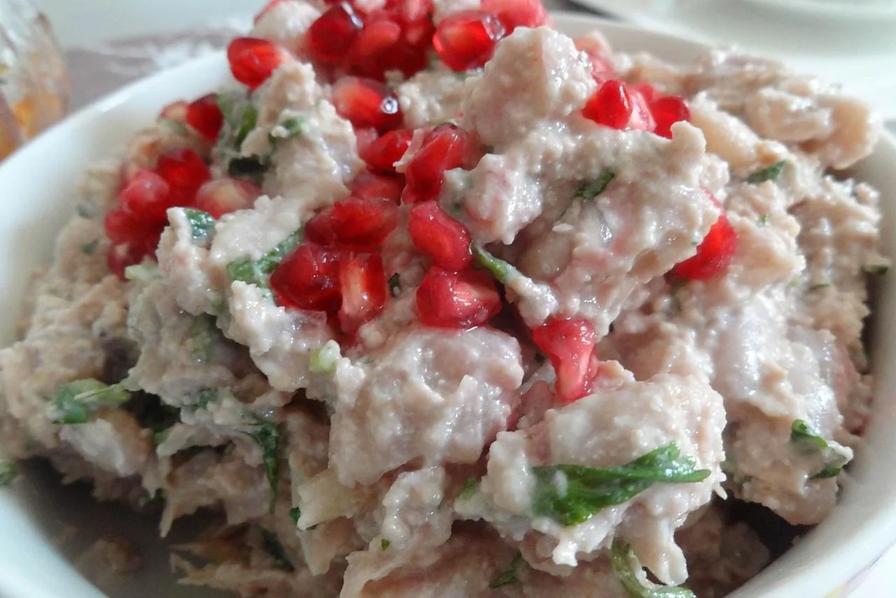 ШАГ 3 Сделать ореховый соус бажа: стакан орехов измельчить в блендере, добавить к орехам измельченный чеснок, зелень, острый перец и добавить уксус по вкусу. Залить любым бульоном, лучше овощным или просто кипяченой водой — до изменения цвета и консистенции. Цвет должен стать светлым, почти белым, консистенции густой сметаны. Попробовать на соль, перец. Может быть, придется добавить еще уксус.