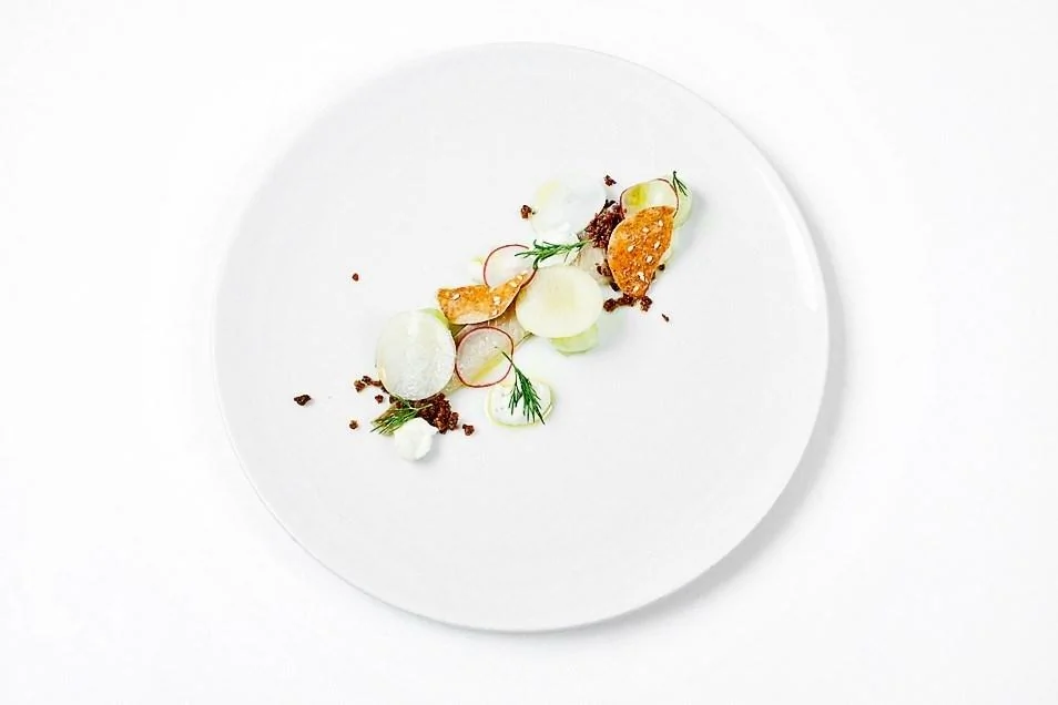 ШАГ 7 Выложить на тарелки подмаринованное филе сельди. Рядом положить кусочки козьего сыра, посыпать рыбу поджаренными хлебными крошками (или сначала поджарить на оливковом масле, а потом раскрошить кусочек черного хлеба). Приложить шарики огурца и кружки редиса и турнепса.