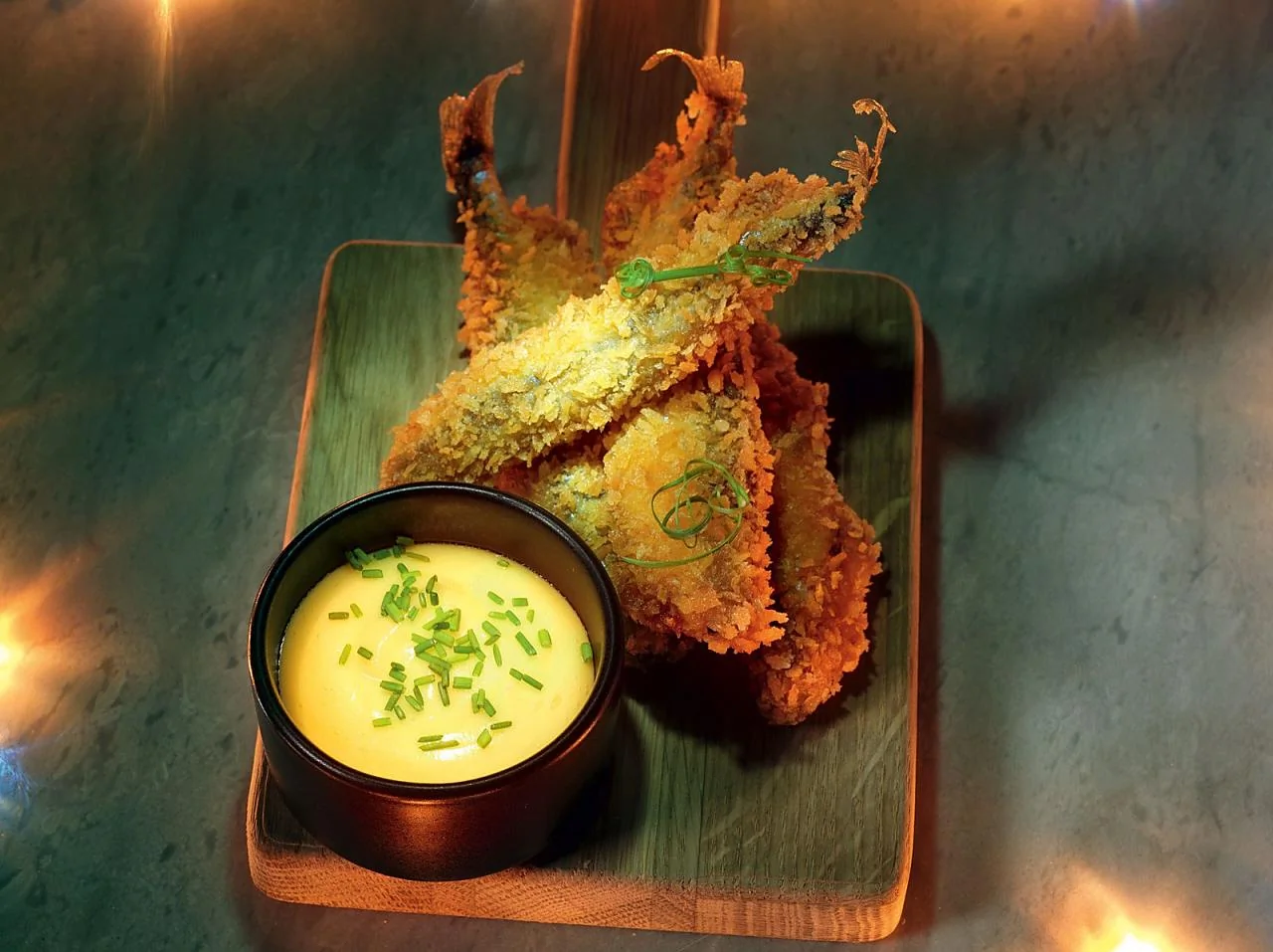 ШАГ 5 Разогреть в сотейнике масло для фритюра. Мойву обмакнуть в кляр, запанировать сухарями панко и жарить во фритюре до готовности, минуты две-три. Подавать с кремом из васаби.