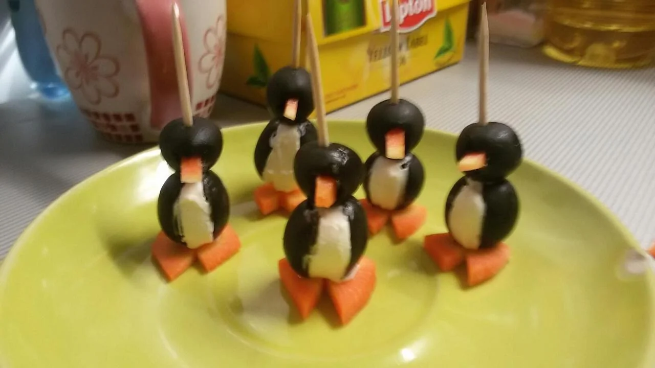 ШАГ 5 Теперь поставить маслины друг на друга и на кружочек моркови, и проткнуть сверху вниз зубочисткой.