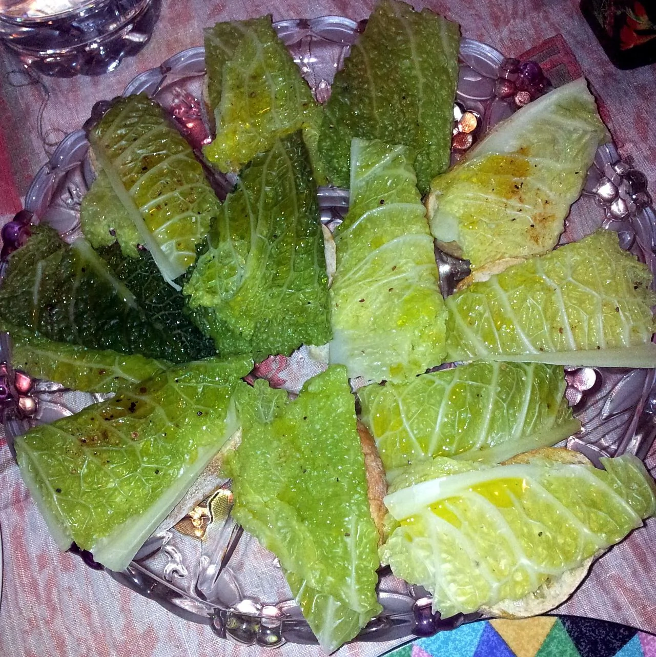 ШАГ 5 Выложить тосты на большое блюдо — листок капусты, тост, 2–3 листка капусты. Сверху еще раз сбрызнуть маслом.