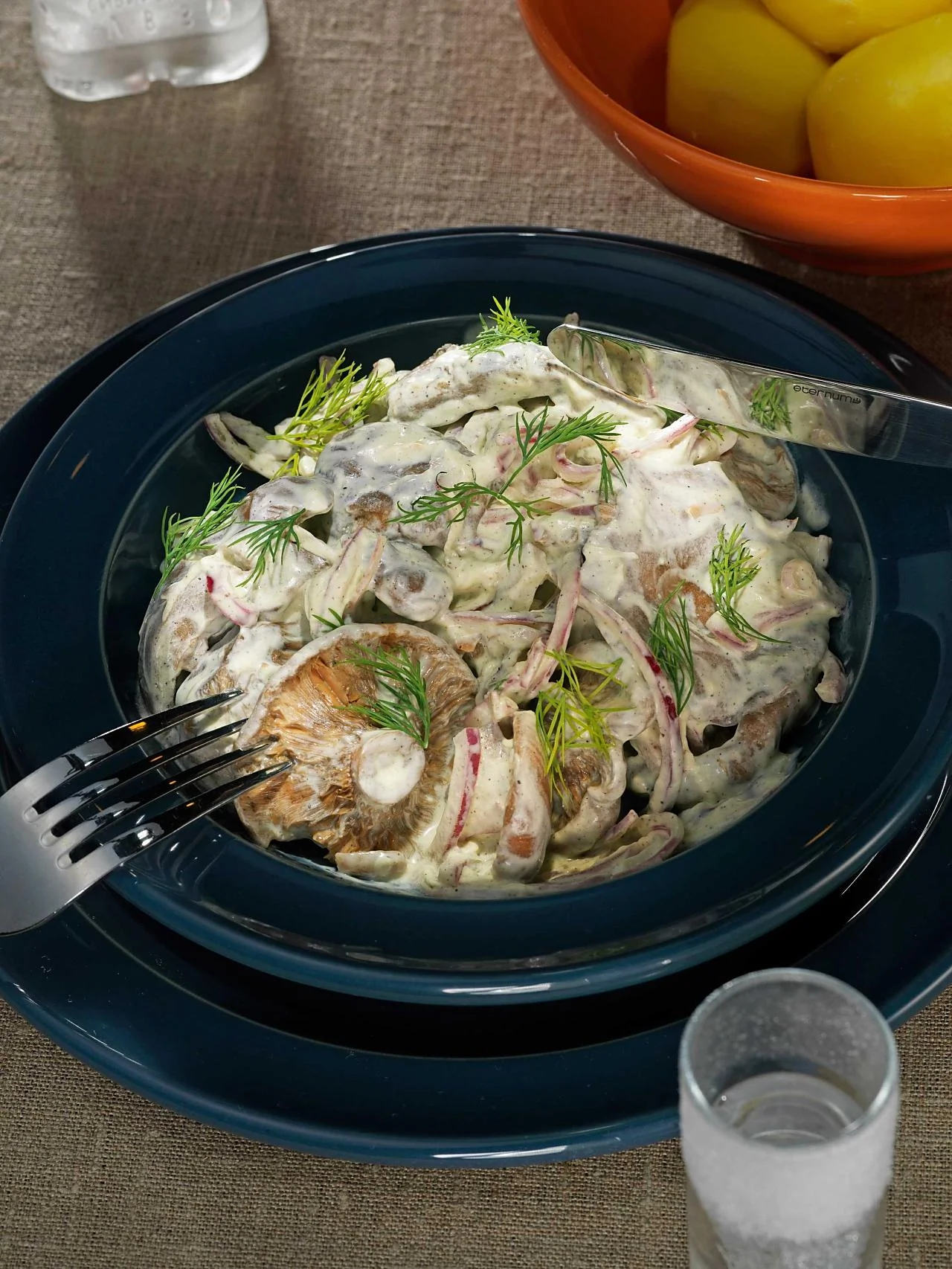 ШАГ 3 Оборвать со стеблей листья укропа. Слить уксус из маринованного лука. Перемешать грибы, сметанно-горчичный соус и маринованный лук с укропом.