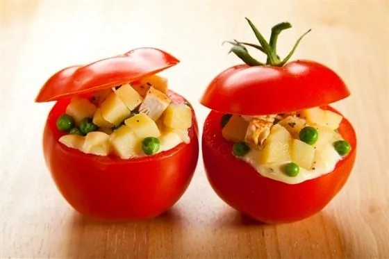 ШАГ 3 Наполните помидоры салатом и отправьте в холодильник на 1 час. Выложите на сервировочное блюдо листья салата, а сверху устройте помидоры.