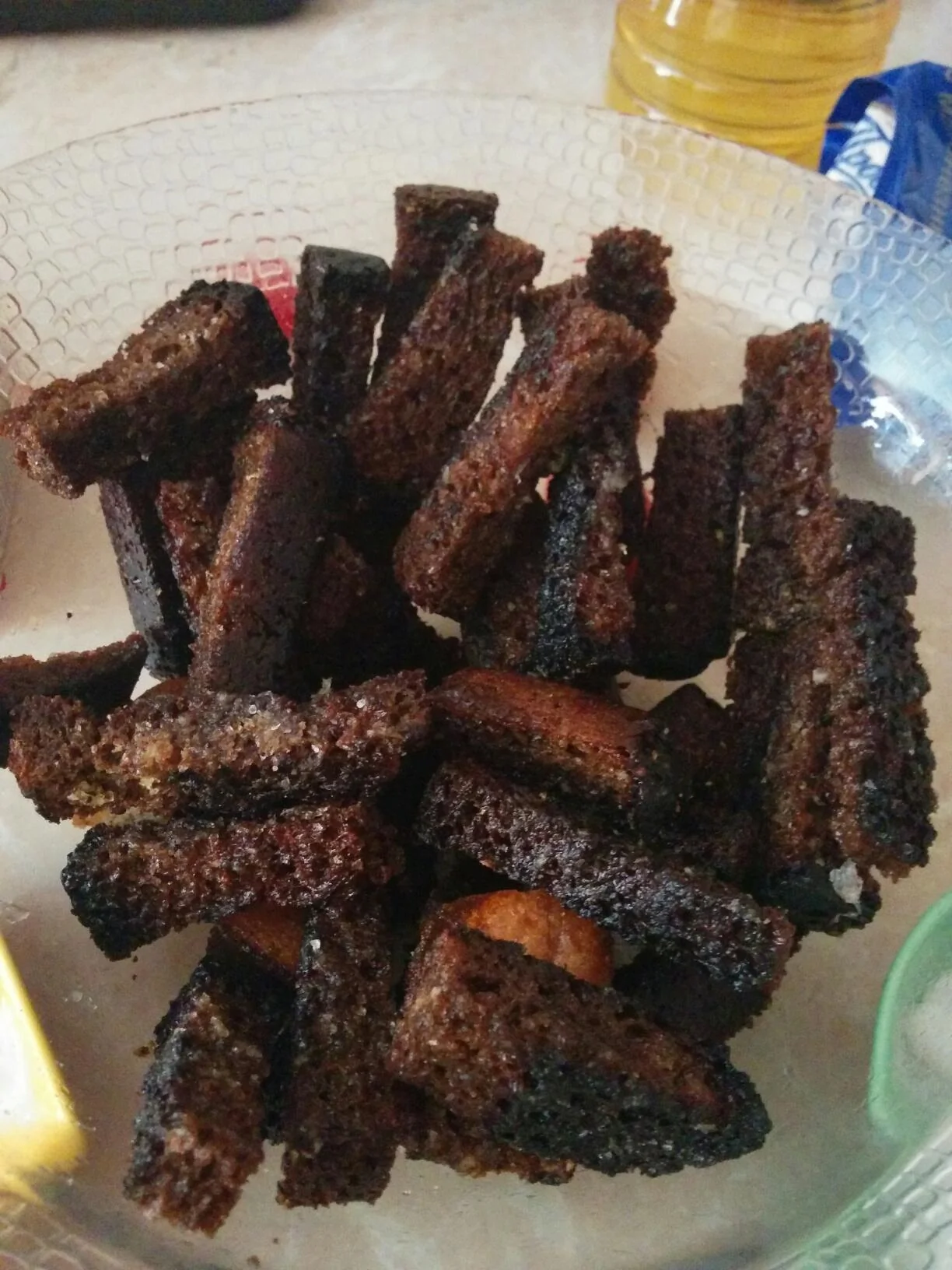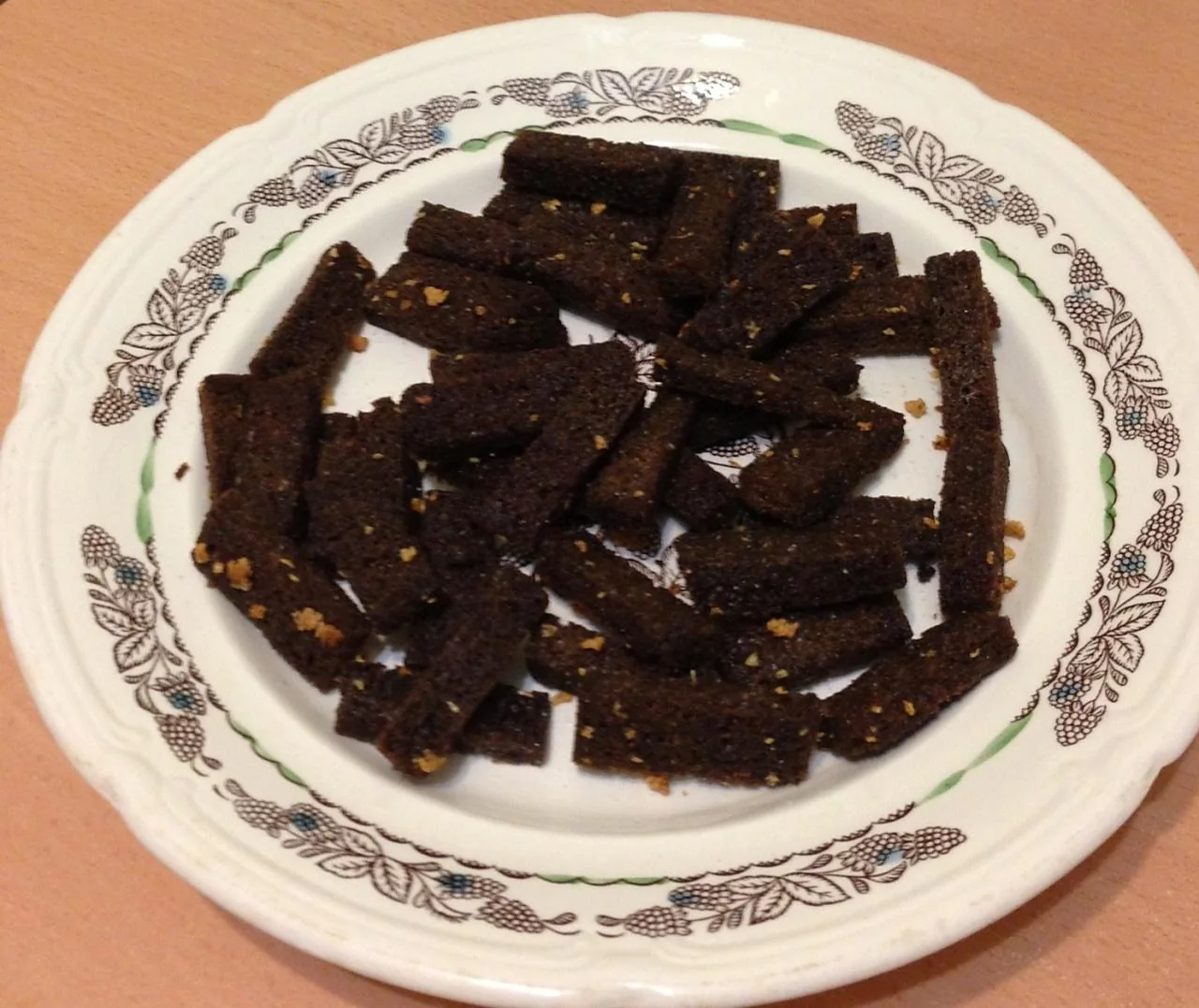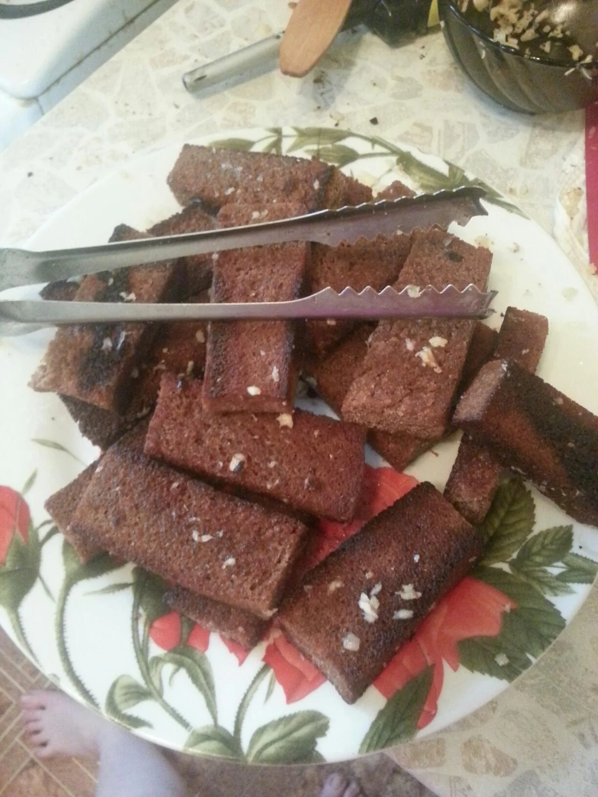ШАГ 1 С бородинского хлеба срезать все корочки. Нарезать хлеб брусочками.