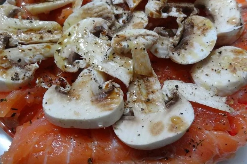 ШАГ 2 Лососину разложить на блюдо. Шампиньоны очистить, протереть (не мыть) и нарезать тонкими пластинками, уложить на рыбу и полить бальзамическим уксусом и оливковым маслом. Посыпать перцем.