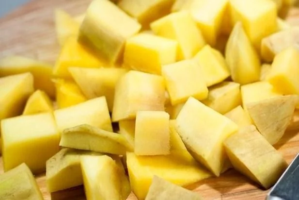 ШАГ 2 Манго очищаем, мякоть отделяем от косточки и также нарезаем мелкими кубиками.