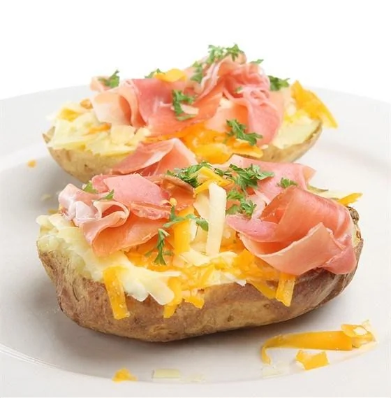 ШАГ 3 Сверху выложите по кусочку масла и пеките еще 10 минут. Перед подачей посыпьте каждую картофелину небольшим количеством натертого на крупной терке сыра и целыми ломтиками ветчины. При желании посыпьте свежей зеленью или тертой апельсиновой цедрой.