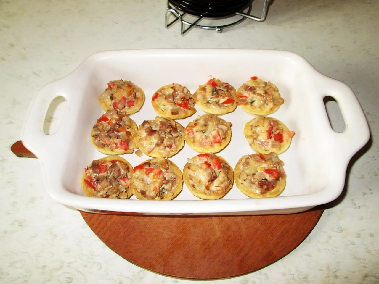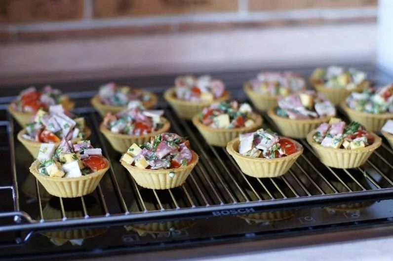 ШАГ 6 Выкладывает в тарталетки начинку и ставим в духовку на 15 минут на 180 градусов.