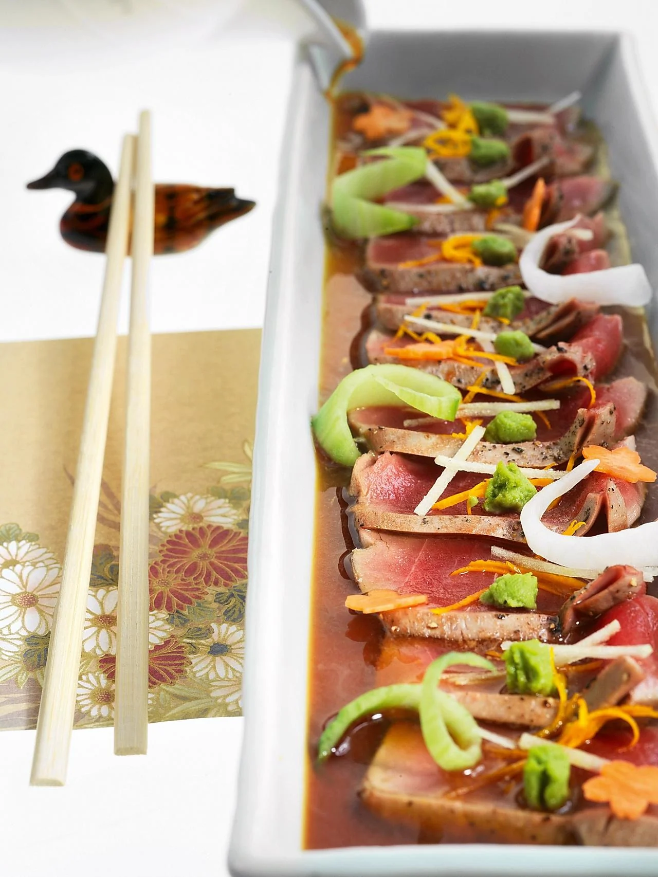 ШАГ 4 Остывшего тунца нарезать тонкими ломтиками и выложить на блюдо. Каждый украсить комочком васаби, затем — яблочной и цедровой стружкой, огурцом, морковью и дайконом. Непосредственно перед подачей влить в блюдо соус.