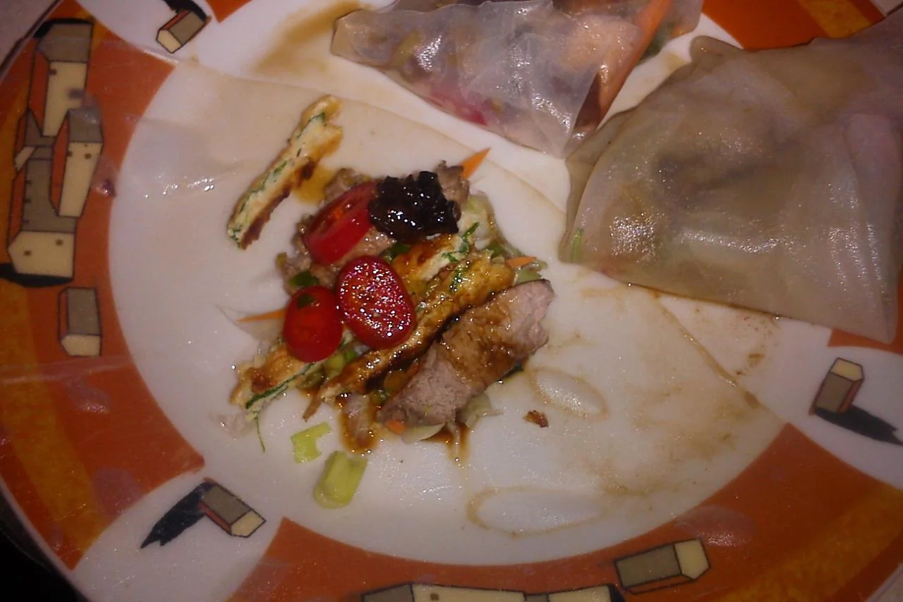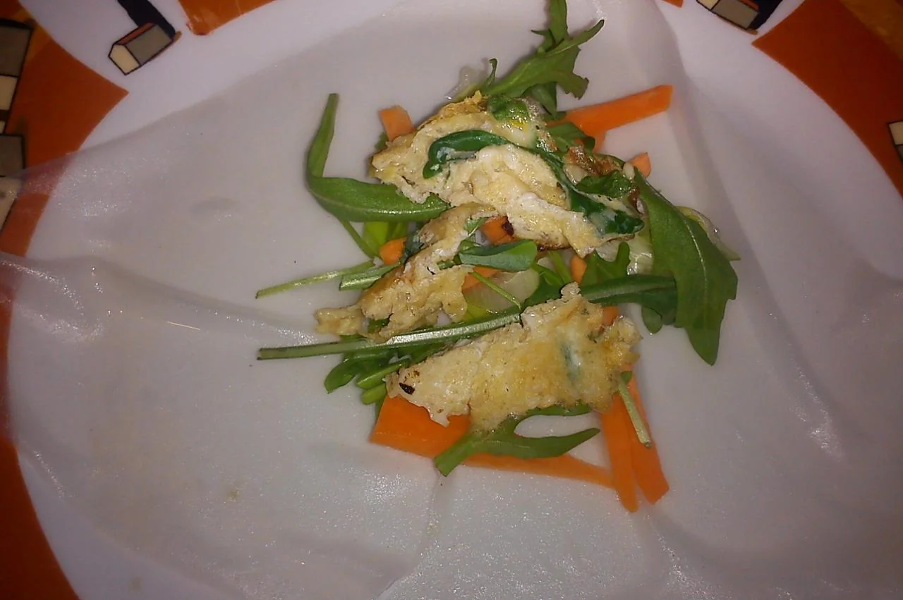 Рисовые блинчики с рукколой, морковью, луком и мясом